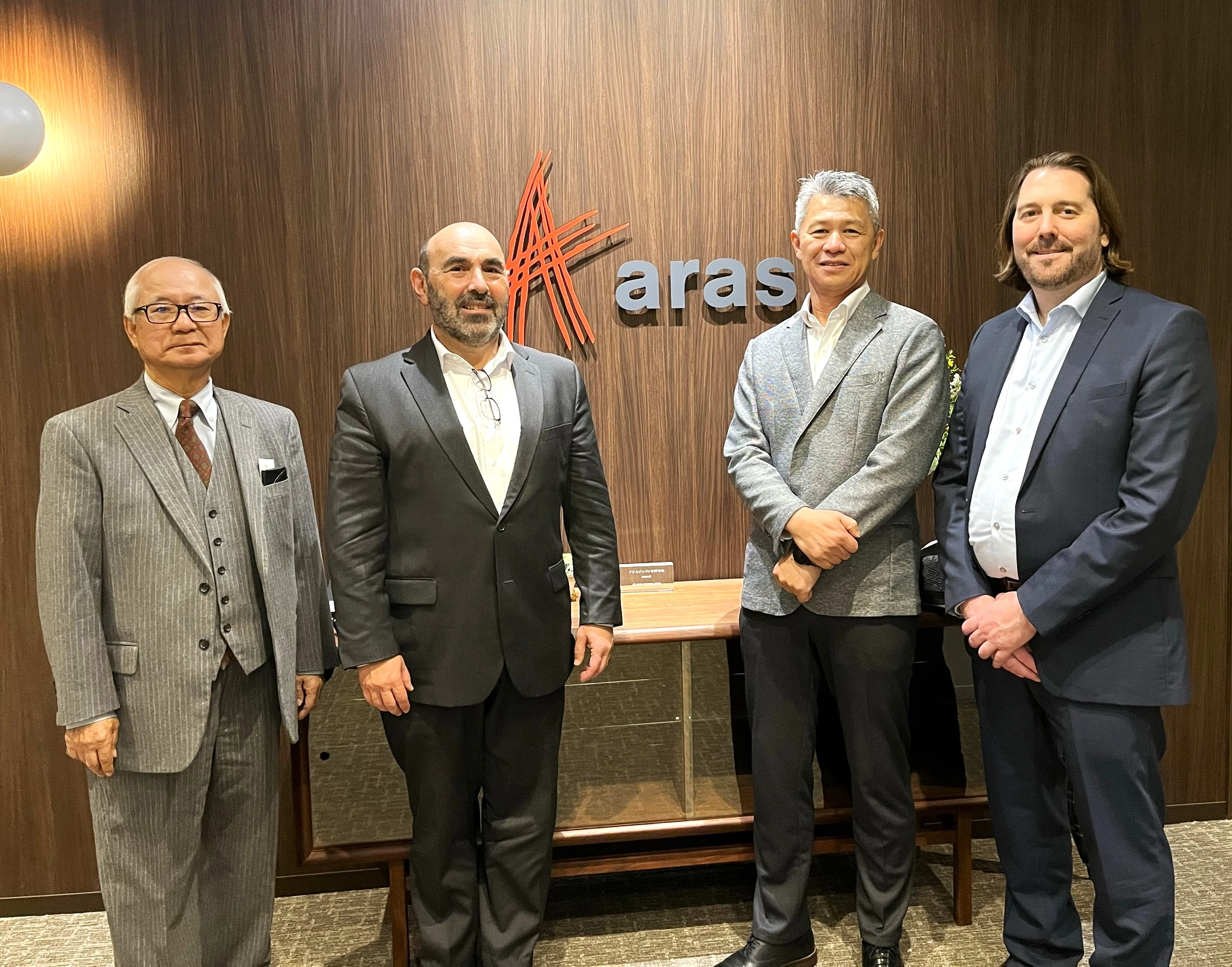 Mr. Seo (CEO, Myrtos Corporation), Mr. Tsinman (President, AMC Bridge), Mr. Hisatsugu (Vice President, Aras Japan), Mr. McAveney (CTO, Aras Corporation)