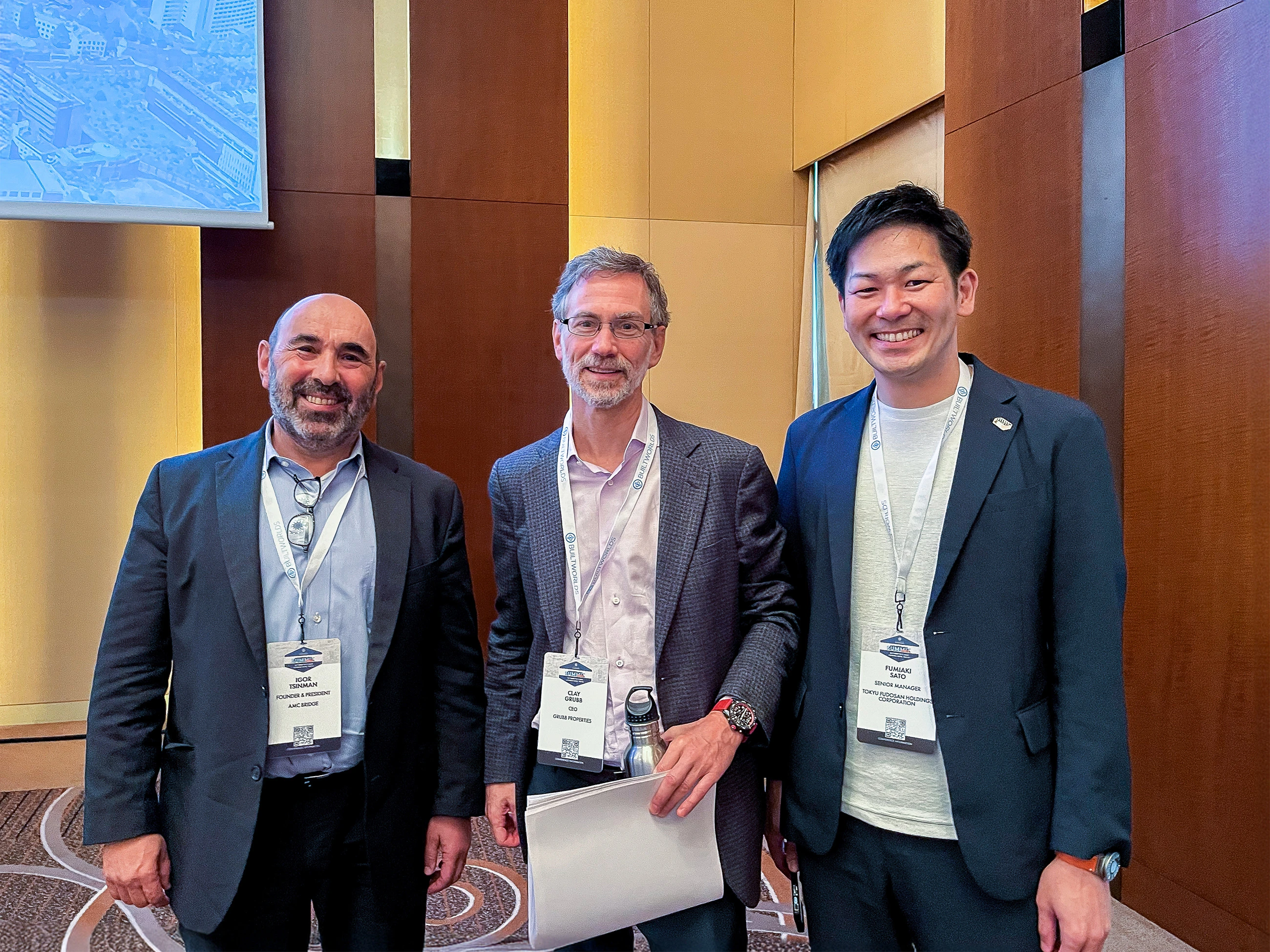 Pic4. AMC Bridge at 2024 Tokyo Summit by BuiltWorlds: Mr. Tsinman (President, AMC Bridge), Mr. Grubb (CEO, Grubb Properties), Mr. Sato (Senior Manager, Tokyu Fudosan Holdings Corporation)